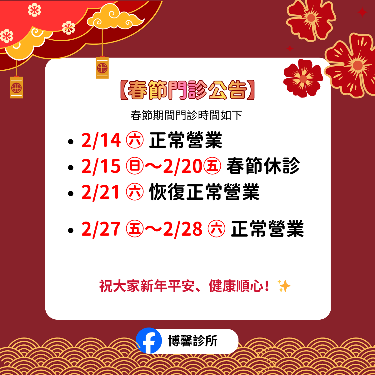 親愛的朋友們,春節期間門診時間如下,請您先行安排就診: * 2/14 (六) 正常營業 * 2/15 (日)~2/22(日) 春節休診 * 2/23 (一) 恢復正常營業 * 2/27 (五)~2/28(六) 正常營業 為避免您白跑一趟,請務必追蹤/開啟粉絲團通知,我們會在確認後第一時間公告最新消息(包含門診時間與未來地址更新)。 祝大家新年平安、健康順心!
